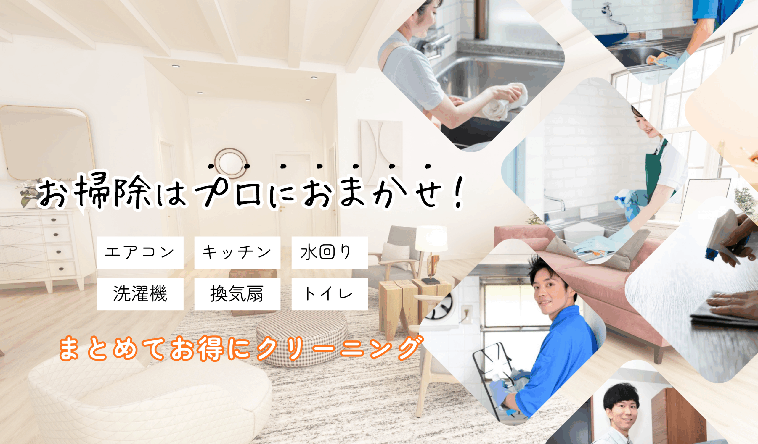 ハウスクリーニングは、専門知識を持つプロの作業スタッフが専用の掃除道具や洗剤を使って掃除を行うサービスです。エアコン・レンジフードや換気扇はもちろんのこと、お風呂や浴室・台所やキッチン・洗面所・トイレなどの水まわりのクリーニングまで、プロのお掃除をご提供します。
